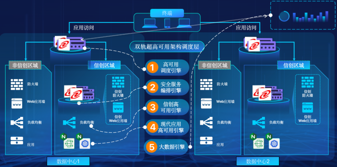 雙軌超高可用架構(gòu)擁有五大引擎,分別是:高可用調(diào)度引擎、安全服務(wù)編排引擎、現(xiàn)代應(yīng)用高可用引擎、信創(chuàng)高可用引擎、大數(shù)據(jù)引擎,可以幫助客戶在新架構(gòu)下, 提升應(yīng)用可持續(xù)性,解決性能瓶頸,提升穩(wěn)定性。在服務(wù)異常情況下,可以通過(guò)實(shí)時(shí)灰度調(diào)度的方式,實(shí)現(xiàn)業(yè)務(wù)的應(yīng)急逃生,保留應(yīng)用故障現(xiàn)場(chǎng)環(huán)境,便于后續(xù)的排錯(cuò)與根因定位。