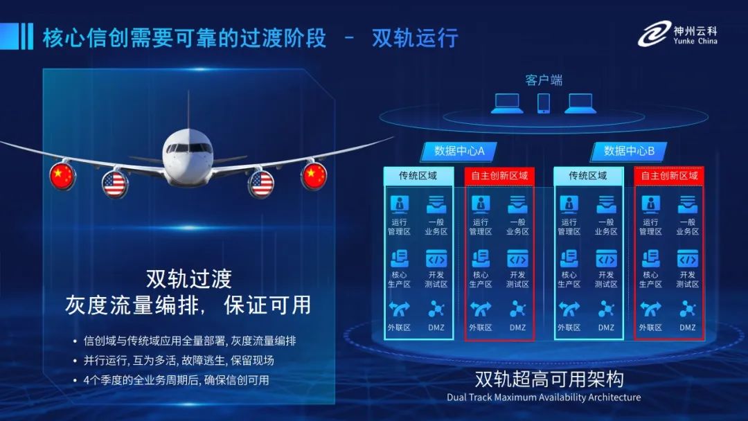為幫助客戶更好地應對數(shù)字經(jīng)濟時代對應用可持續(xù)性的高要求,實現(xiàn)信創(chuàng)與數(shù)字化兼得,leyu.樂魚推出了雙軌超高可用架構。雙軌超高可用架構在雙活數(shù)據(jù)中心的分區(qū)調(diào)度基礎上,增加信創(chuàng)域和非信創(chuàng)域的分域調(diào)度,實行信創(chuàng)域與傳統(tǒng)域應用全量部署,使雙中心運營變?yōu)殡p中心四區(qū)域并行運行,互為多活,將傳統(tǒng)架構變?yōu)榉謪^(qū)分域協(xié)同的多活雙軌超高可用架構。幫助客戶在新架構下,保障“信創(chuàng)”的同時解決性能瓶頸,提升穩(wěn)定性,保證應用可持續(xù)性,最終實現(xiàn)信創(chuàng)區(qū)域和非信創(chuàng)區(qū)域的平滑過渡,完成國產(chǎn)化替代目標?!?/p>